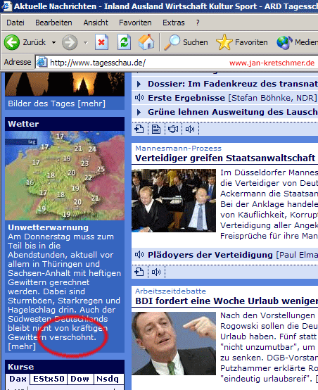 Nach einer kurzen Hinweismail meinerseits an die Tagesschauredation wurde die Vorhersage überarbeitet. Interessant auch der Wechsel von "dabei sind Sturmböen ... drin" zu "dabei sind Sturmböen ... möglich". Da hat die Deutschlehrerin dem Praktikant wohl auf die Finger gehauen ;)